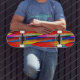 La pintura raspada y escarpada en muchos colores crea un patineta interesante y llamativo.