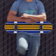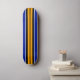Este diseño fresco y deportivo cuenta con una franja central vertical amarilla brillante, dividida por una delgada pinstripe negra, a continuación con rayas y pipas blancas. La franja exterior de cada lado es el azul real.
