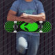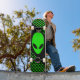 Este monopatín ofrece un diseño verde de neón de la cabeza del extranjero de espacio.