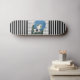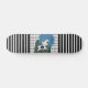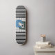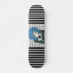 Un bonito patineta con franjas blancas y negras atrevidas y modernas, un patrón de gingham fresco y un personaje cómico chica con una tableta en sus manos con un pegatina de símbolo de paz.