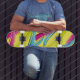 Este skateboard de calidad se muestra en un color sólido de amarillo con una colorida impresión de olas. Compra tal cual o personalizar este artículo a tu gusto.