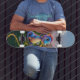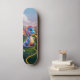 Cute fire breathing dragon sitting in a field of colorful flowers is an adorable design that would be perfect for a skateboard for any child.