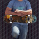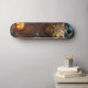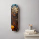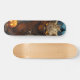 La patineta presenta un diseño peculiar y llamativo, representando una criatura gatuna con un toque demoníaco y asociada a la temática de Halloween. La figura del gato está decorada de manera que incorpora elementos como una calabaza, sugiriendo una fusión entre la imagen tradicional de un gato y la estética de esta festividad. La combinación de la apariencia demoníaca y la presencia de la calabaza añaden un elemento festivo y fantástico al diseño de la patineta, creando una imagen única y visualmente impactante.