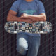 Patinar con estilo con esta patineta única, con un diseño de mosaicos de denim con problemas adornados con cráneos, flores y vibraciones de boho. Combinando perfectamente la estética hippie, retro y del gótico, esta junta es una declaración audaz para quienes adoptan un estilo no convencional y arriesgado.