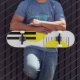 Ilustracion de diseño abstracto con formas geométricas (círculos y rayas) en tonos amarillos y negros sobre fondo blanco.