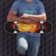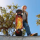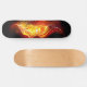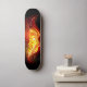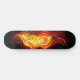Una brillante pluma de pavo real hecha de fuego y llama sobre fondo negro.