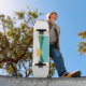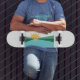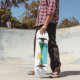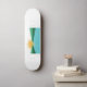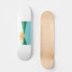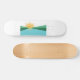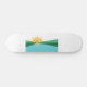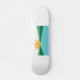 Skateboard with a design with the flag of Coral Springs, Florida. A white, green, and blue flag with a yellow rising sun