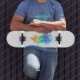 Grandes medusas de azulejo brillantes, de dibujos artísticos, con largos tentáculos en blanco, pintadas con fondo multicolor de acuarela. Mariscas arcoiris.