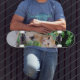 La patineta cuenta con un diseño temático de un gato. En particular, se destaca que el gato en el diseño se encuentra en una posición de descanso, pero con una actitud atenta, como si estuviera preparado para cazar algo. La imagen que se evoca es la de un felino relajado pero alerta, lo que añade un toque de dinamismo y curiosidad al diseño de la patineta. Este enfoque creativo fusiona elementos lúdicos y felinos, generando una imagen única y llamativa para la patineta.