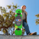 Un monopatín que tiene un gorila del estilo del dibujo animado el llevar de los vidrios 3d con un fondo verde.