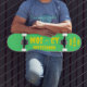 20 cm großes Skateboard grün mit gelber aufschrift.