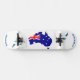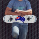 El diseño de la bandera que se muestra en el patineta presenta de forma destacada una imagen vectorial con un fondo blanco nítido, realzada por plumas de color turquesa colocadas en ambos extremos. Esta composición artística se complementa con la inclusión de la tipografía que audazmente proclama "Australia", que efectivamente transmite orgullo e identidad nacional a través de una lente de diseño moderna. La interacción armoniosa de colores y elementos contribuye a una representación llamativa y significativa adecuada para el deporte.