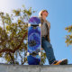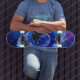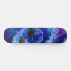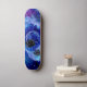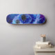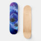 diseño tradicional de acuarela con un planeta azul y violeta en una galaxia azul y violeta con platillos voladores en forma de cubo que se acercan en una patineta.