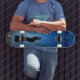 Patineta de marca Dd, con ilustraciones gráficas de un pañal vestido negro sobre un fondo azul, con un débil cráneo azul. Personalice el texto del personalizado para que se ajuste a sus necesidades.