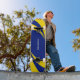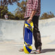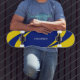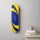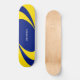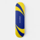 Líneas onduladas azules y amarillas con centro azul y caligrafía Skateboard.
