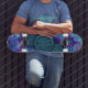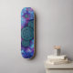 una obra de arte decorativa abstracta de mandalas azules flotando como estrellas en el espacio en colores azul y violeta en una patineta