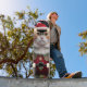Un gato real vestido con un traje de santa Claus con un fondo floral, un diseño vintage