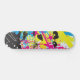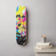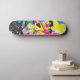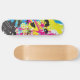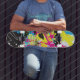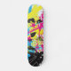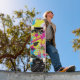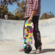 Gráfica estilo retro de los años 80 con formas simples con colores llamativos en las patinetas.