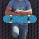 Ideas femeninas del regalo del buñuelo. Los anillos de espuma lindos con helar azul, púrpura, rosado y amarillo, y el arco iris asperjan con un fondo del azul de cielo. El regalo perfecto para los amantes del buñuelo.