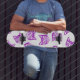 Mollycat Muddle, un diseño de Alan Hogan se presenta aquí como arte de skateboard. Este diseño se basa en la pintura original del artista llamada "El gato finlandés".