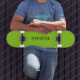 Patineta de color verde limón de moda en el estilo de los machos con su nombre de monograma o iniciales u otro texto en una letra simple.