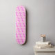 Este impresionante skateboard presenta una imagen de arte digital de un bebé unicornio rosa mágico y bonito. El cuerpo principal del unicornio es rosa y el hombre y la cola son dos tonalidades de rosa diferentes. El unicornio tiene cascos dorados y un brillante cuerno de oro sobre su cabeza. Tiene un ojo en forma de diamante rosado. El unicornio tiene una gran sonrisa en la cara.