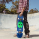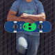 Muestra tus movimientos en el patinaje infantil personalizado Green Alien de este niño. Está diseñado con una cabeza alienígena verde brillante que sobresale la lengua en el centro del personalizable de fondo azul brillante. El nombre está escrito en negrita con letras blancas. Hace una gran idea de regalo para los amantes de la ciencia ficción, el espacio ultraterrestre y los OVNI. Haga clic en la opción personalizar plantilla e introduzca el nombre.
