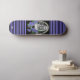 Patineta de la marca Dd, hecha en negro y violeta, con gráficos de una novia esquelética con flores moradas, en el centro de la tabla. Los dos extremos de la tabla se realizan en un patrón de rayas moradas y negras.