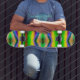 Este diseño me recuerda a un ojo reptil en el medio. Resumen con colores primarios de verde lima, rojo amarillo y morado azulado.