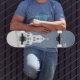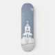 El diseño presenta un paisaje festivo de una ciudad nevada con casas y una iglesia.
