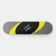 Patrón de ajedrez en blanco y negro, líneas onduladas amarillas con centro negro y Skateboard caligráfico.