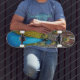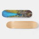 Skateboard con el original arte de un pavo real con su plumaje en exhibición. Las plumas de cola iridiscente brillan en tonos azules, verde azulados, verdes y morados, dándole a este orgulloso pájaro la apariencia de la realeza. Los colores vivos de esta majestuosa ave de arveja brillan en este arte que llena todo el espacio de diseño.