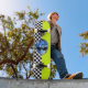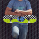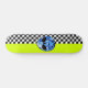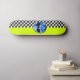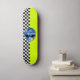 Neon Alien Checkered Skateboard Deck de BigTexFunkadelic, con una impresión a cuadros en blanco y negro dividida con fondo verde lima, y una pizarra de pintura en azul con cabeza alienígena encima.