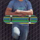 Añade color y movimiento a tu paseo con esta cubierta de patinaje a rayas, con tonos azul, lima y amarillo en un patrón lineal moderno. Perfecto para quien quiera destacar en el patinaje o en la calle.