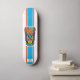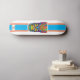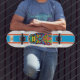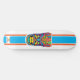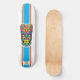 Skateboard con colorido diseño de cabeza de tiki polinesio sobre rayas de carreras azules y naranjas.