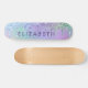Patineta femenina personalizada con un purpurina de imitación morado, azul y verde. Añade su nombre en una tipografía morada.