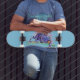 acuarela colorida y arte de tinta de una rana morada sentada en un árbol mirando al espectador en una patineta