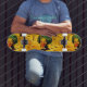 My Design presenta un retrato estilizado de una bella mujer africana que usa un colorido pañuelo en la cabeza. La cabecera de la cama está decorada con motivos de hojas verdes y amarillas. Su cara está llena de una silueta al atardecer, llena de pájaros volando por el cielo y un paisaje arbolado. Lleva pendientes grandes y ornamentadas y un collar con cuentas. Ilustracion vectorial de estilo pop original Derechos de autor BluedarkArt TheChameleonArt.