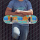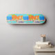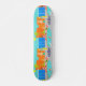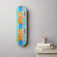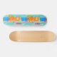 ¡Entra! ¡El agua está bien! Este Skateboard Fiesta de la piscina retro cuenta con un dibujo animado y personalizado repetido de un fiesta de piscina divertido y sofisticado. El diseño moderno de mediados de siglo se centra en una piscina redonda situada en un gran patio gris de hormigón. La piscina está llena de agua turquesa. La piscina está rodeada de ladrillos naranjas y hay una pizarra de inmersión blanca y de tablas de plank, para que te sientas como en un alma atrevida. Una bola de playa roja y blanca flota en el agua. En el lado opuesto de la piscina, dos fiestas colocan sus pies en el agua, mientras descansan sobre toallas de playa de rayas rojas y blancas. La mujer de pelo negro lleva un traje de baño rosa de una sola pieza. Junto a ella hay una bebida tropical en un coco con un pequeño paraguas y una paja verde. El rubio lleva baúles brillantes y verdes. Le patean con las manos detrás de la cabeza. A la izquierda de la piscina hay un hombre distinguido con el pelo blanco y baúles de jade que sostienen una bebida en una concha de coco. ¡Sabemos que es distinguido porque es un hombre de pelo blanco! Está hablando con una mujer con el pelo rubio y una figura de cristal de púas con un traje de baño turquesa. La toalla de playa es amarilla. Detrás de esta escena está la silueta verde de una palmera y una casa futurista, naranja y de ladrillo. A través de las grandes cristaleras azules, de suelo a techo, se ve la silueta de una televisión, una silla, un reloj otomano y una estrella. El cielo detrás de la casa es un turquesa sin nubes con un sol redondo y amarillo.