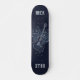 Este skateboard tiene un sencillo sketch de electro-guitarra con notas musicales formando una forma cardíaca sobre fondo azul oscuro. También hay dos textos de personalizable "rock" y "star".