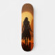 La patineta presenta un diseño específico, el cual destaca la silueta de una mujer guerrera. Este diseño se encuentra ambientado en un escenario de amanecer, sugiriendo la imagen de la guerrera en un momento de fuerza y determinación. La patineta, además de ser un medio de transporte, sirve como lienzo para expresar este concepto artístico que incorpora la figura femenina en un contexto de fortaleza y valentía. La combinación de la silueta de la mujer guerrera y la atmósfera del amanecer podría transmitir un mensaje simbólico relacionado con la energía, el empoderamiento o la lucha.