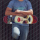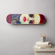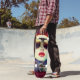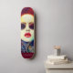 Un retrato de cerca de una mujer que usa gafas de sol y pintalabios rojos, y que usa una bufanda con temática de steampunk es la característica de esta tabla de patinaje única. Su nombre está en la secuencia de comandos en un borde violeta oscuro en la parte inferior.