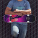 Pasee por las calles en un estilo retro-futurista con este patinador de vaporwave, con un naranja eléctrico al atardecer, situado contra un cielo estrellado oscuro. Las palmeras de silueta son altas, mientras que una rejilla retro brillante se extiende a lo lejos, capturando la esencia de la nostalgia de las ondas sintéticas de los años 80. Los sutiles efectos de brillo, las líneas de exploración y un brillo de ensueño le dan vida a este diseño, haciéndolo perfecto para los patinadores que aman la estética audaz y las vibraciones futuristas. Ya sea que rompas el pavimento o lo exhibas como arte, este llamativo skateboard es imprescindible para cualquier entusiasta de la ola de vaporización.