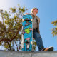 Patine en estilo con un pequeño robot azul triste en sus talones.