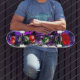 Esta tabla de skate única tiene un aspecto fresco y colorido de graffiti, con rosas, cerezas, nubes y relámpagos. Disponible en varios tamaños y estilos diferentes, esta tabla es perfecta para patinar todos los días, o incluso para montar en su pared como una pieza de arte llamativa.