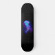Gran medusa azul, de dibujo artístico, brillante y brillante, con largos tentáculos sobre fondo negro con bioluminiscencia violeta. Luminosas medusas.