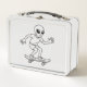 This metal lunchbox features an imaginative illustration of a space alien skateboarding, blending cosmic curiosity with laid-back skater attitude in a way that feels fun, bold, and full of personality. The artwork captures an otherworldly character cruising effortlessly on a skateboard, bringing together streetwear style and classic science fiction inspiration. With its playful nods to extraterrestrial life, UFO culture, and sci fi imagery, this lunch pail instantly stands out from ordinary designs, making it a memorable and expressive choice for everyday use. Whether you’re packing meals for school or heading into the workday, this lunchbox adds a sense of creativity and individuality to your routine.