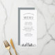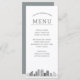 Una serie de menús de comida personalizados para su próximo evento temático de boda en la hermosa ciudad de Houston, Texas. Cuenta con un ilustracion de estilo deco del perfil de la ciudad. Por encima de esto, hay puntos para su selección de menús única. Al revés, un suave color gris níquel con un espacio para tu propio mensaje de agradecimiento a los invitados bodas. Estos menús le darán un gran acento a su cena de ensayo, fiesta de compromiso o cena de boda. Los elementos coincidentes están disponibles en el complemento que puede incluir, servilletas de papel coincidentes, placas de papel, tarjetas de número de tabla y tiras de papel.