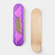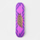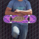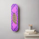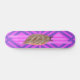 Este tablero de patinaje tiene una babosa marrón y jengibre en el medio. El fondo se compone de una mezcla de líneas violetas y rosas que forman formas de rombo y flecha por todo el patinaje.