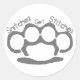 ¡Que estos carteristas sepan qué pasa publicándolo por todas partes! Con esta hoja de 20 pegatinas de alta calidad con nuestro logo de nudillos de latón y el lema "Snitchez Get Stitchez" en tipografía punteada, puedes dejarles el mensaje literalmente en cualquier parte!